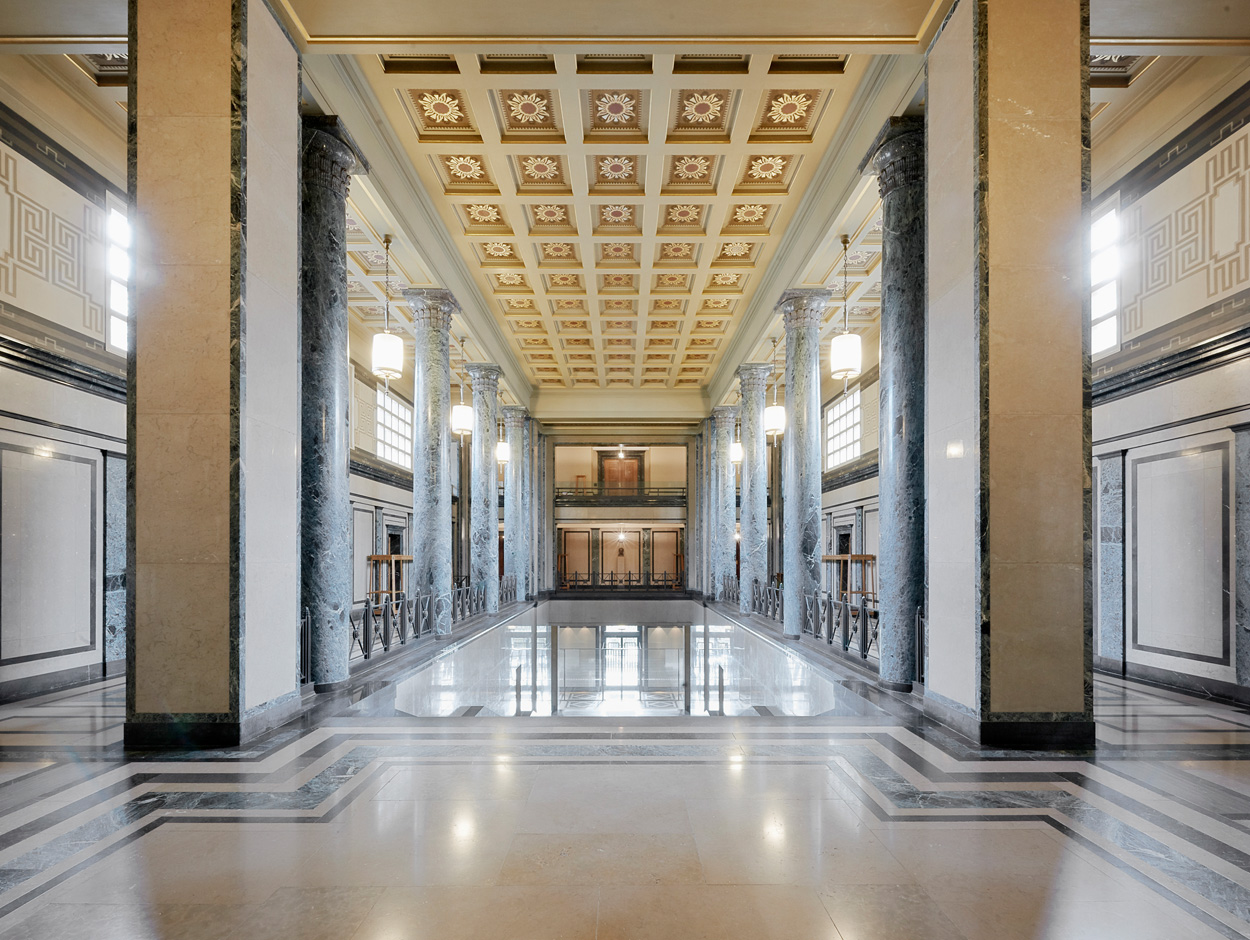 Für Eingang, Treppenhaus und Vorhalle wurde italienischer Marmor in antikem Grün, schwarz-beigefarbener Marmor aus St. Triphon und grauer Marmor aus Monthey verwendet.